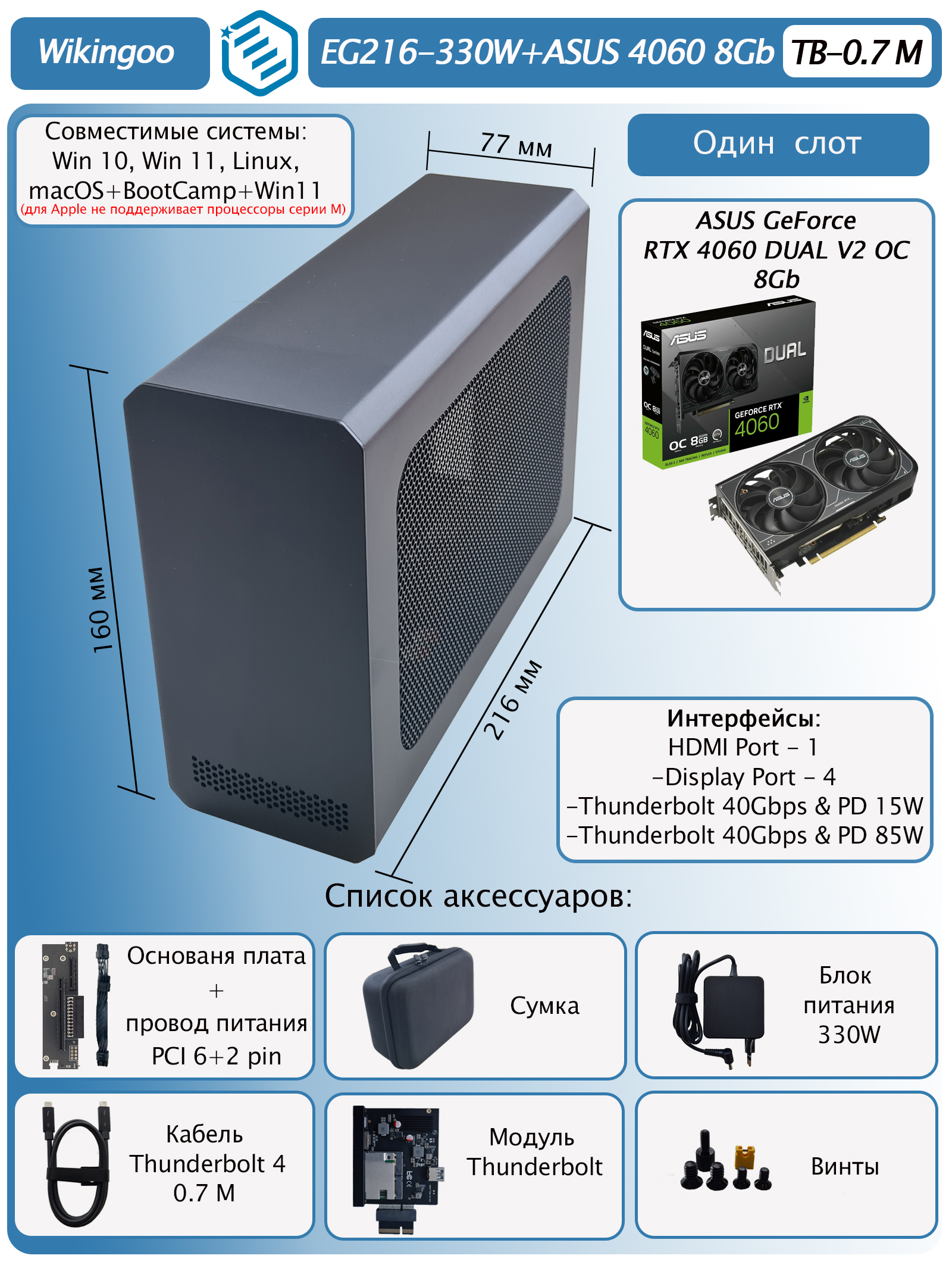 - Внешняя видеокарта Wikingoo EG216-330W + ASUS GeForce RTX 4060 Dual OC Edition 8Gb.